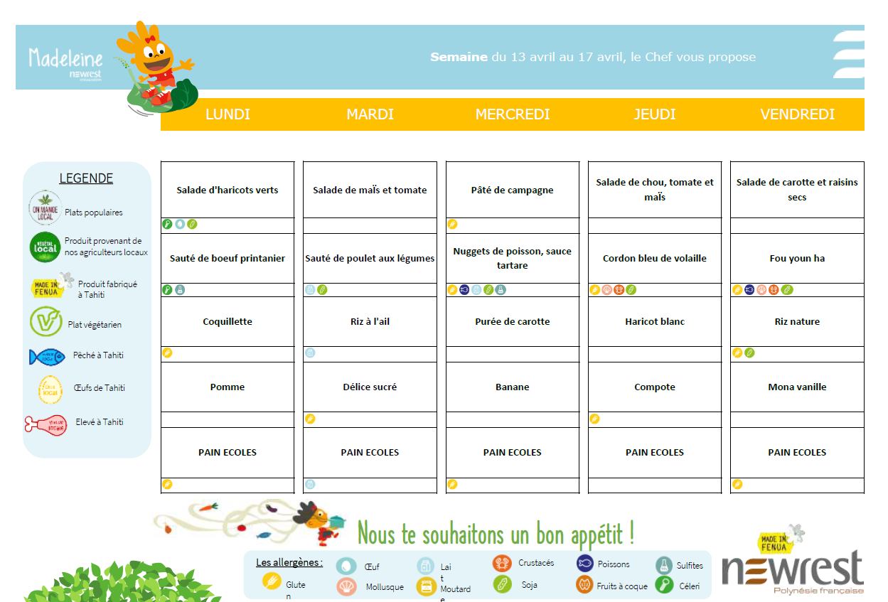 Ia ora na à tous, veuillez trouver ci-dessous les repas des écoles du 13 au 17 avril et les collations des écoles maternelles prévues pour toute la période du 13 avril au 20 mai 2026.